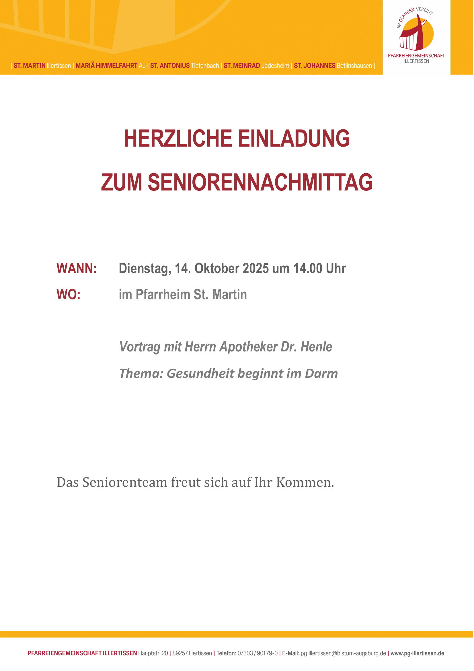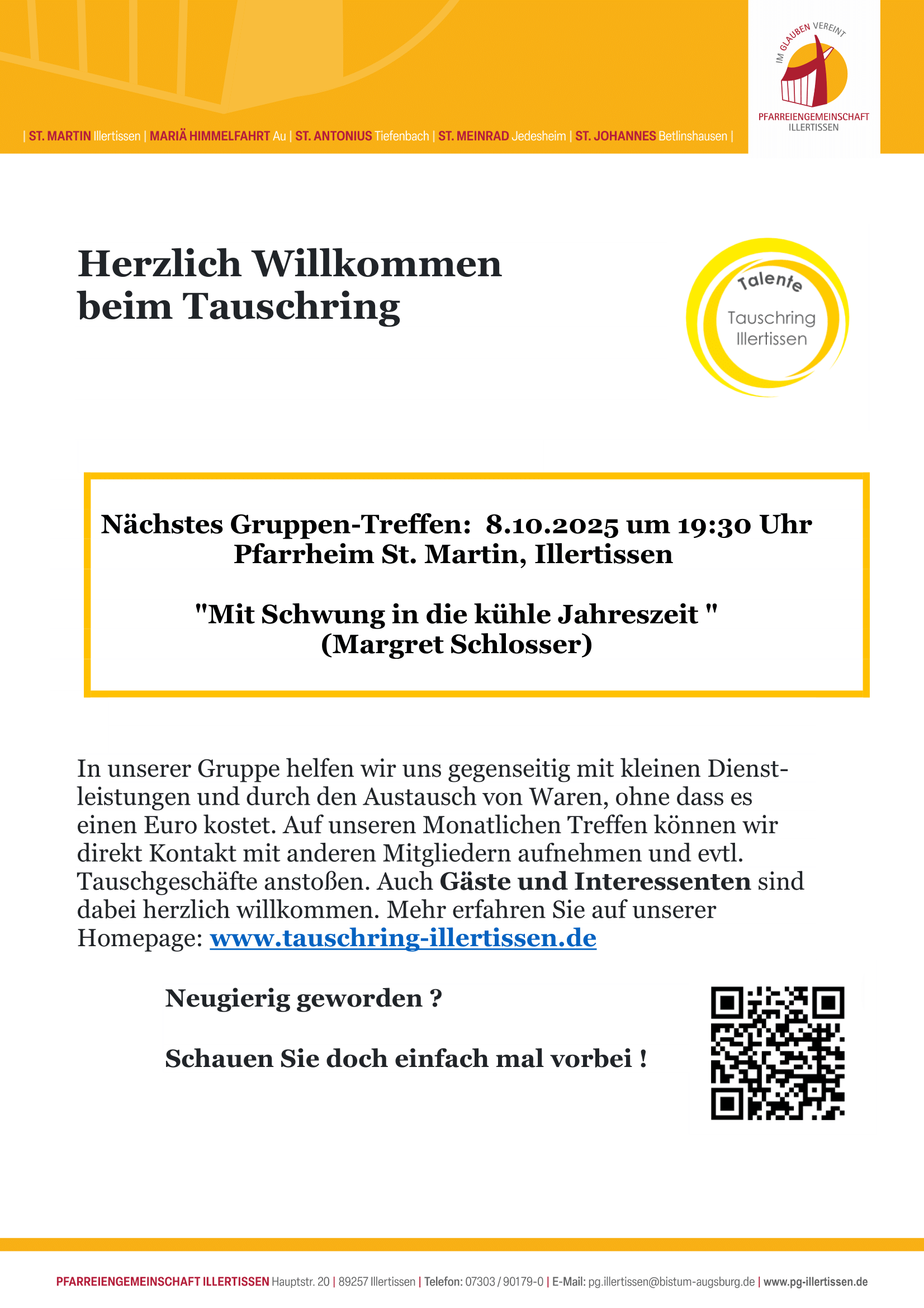 Laden Sie den Flyer zur Friedenswallfahrt der Pfarreiengemeinschaft Illertissen hier herunter: Flyer zur Friedenswallfahrt der PG Illertissen |
