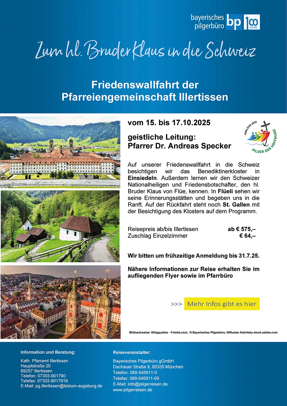 Laden Sie den Flyer zur Friedenswallfahrt der Pfarreiengemeinschaft Illertissen hier herunter: Flyer zur Friedenswallfahrt der PG Illertissen